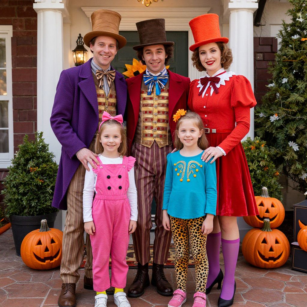 Family dressed in vibrant Willy Wonka-themed costumes gather together for Halloween, featuring a man in a purple suit, a woman in a red dress, and two children in colorful outfits, including one in a pink jumpsuit and another in a blue top with leopard-print pants.