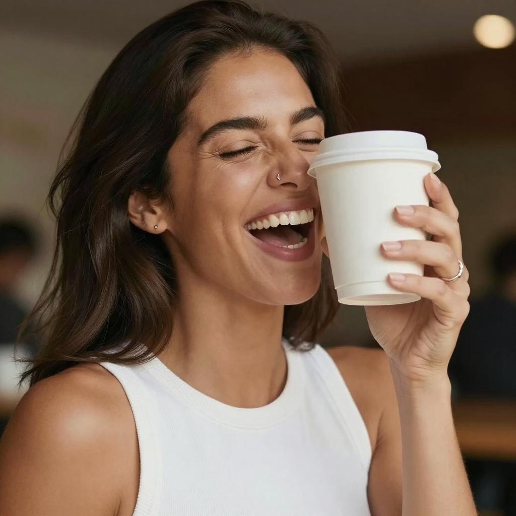 Photograph of a smiling woman with medium-length, dark brown hair, and tan skin. She's wearing a white sleeveless top and holding a white coffee cup close to her face. Her eyes are closed, and her mouth is wide open in a joyful laugh. The background is blurred, with warm, dark tones. She has a small silver nose ring on her left nostril and a simple silver ring on her right hand.