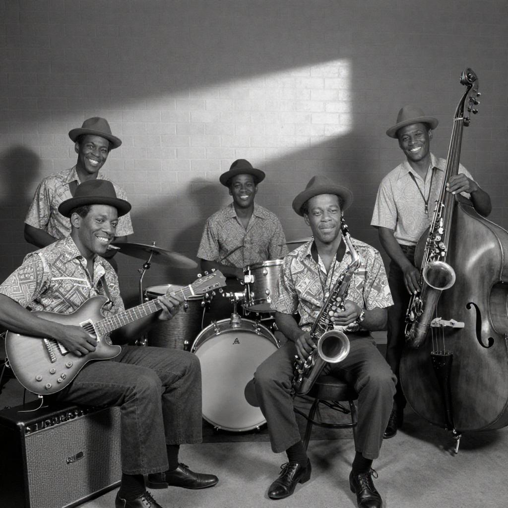 Black and white photograph of a 1960s jazz band. Seven black male musicians, wearing hats and patterned shirts, sit and stand around drums and amplifiers. One guitarist sits on a stool, smiling, while another stands behind drums, smiling. Bassist and saxophonist on the right, guitarist on the left. Sunlight casts shadows on brick wall background. Musicians hold and play guitars, saxophone, and drums. One drummer stands behind kit, smiling. Casual, relaxed atmosphere.