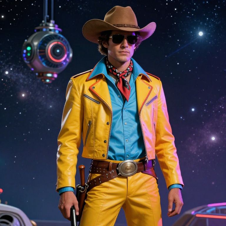 A futuristic space cowboy in a vibrant suit stands against a cosmic backdrop, evoking a retro 1970s Flash Gordon aesthetic.