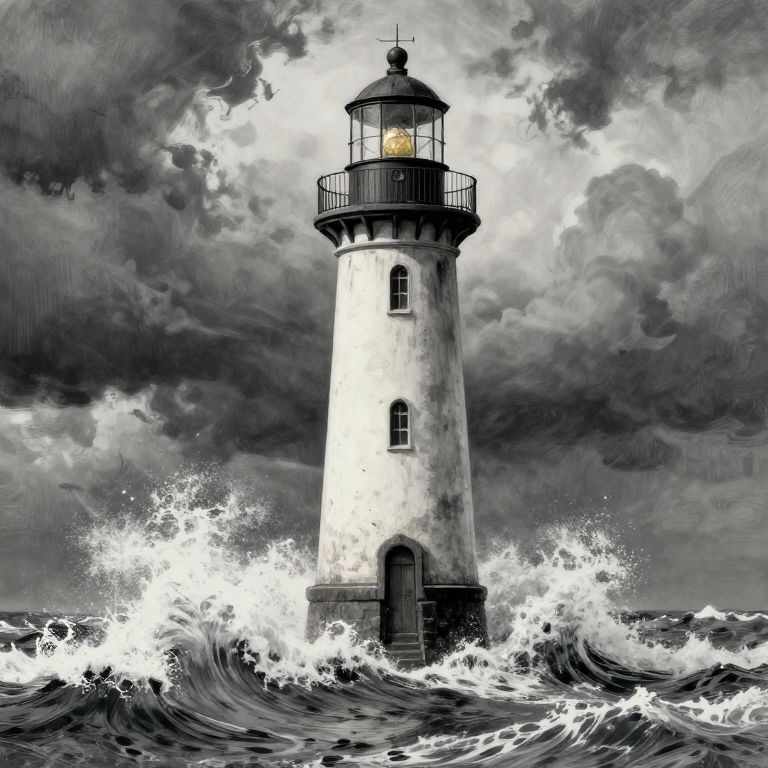 A digital illustration in grayscale depicts a tall, white lighthouse with a black top and balcony, standing amid turbulent waves crashing against its base. The lighthouse, centered in the frame, features a small, arched door and a single window near its top. Dark, stormy clouds fill the sky, creating a dramatic contrast with the bright, white lighthouse. The waves are depicted with high detail, showing white foam and splashes. The overall style is realistic with a touch of dramatic emphasis on the contrast between the calm lighthouse and the chaotic sea.