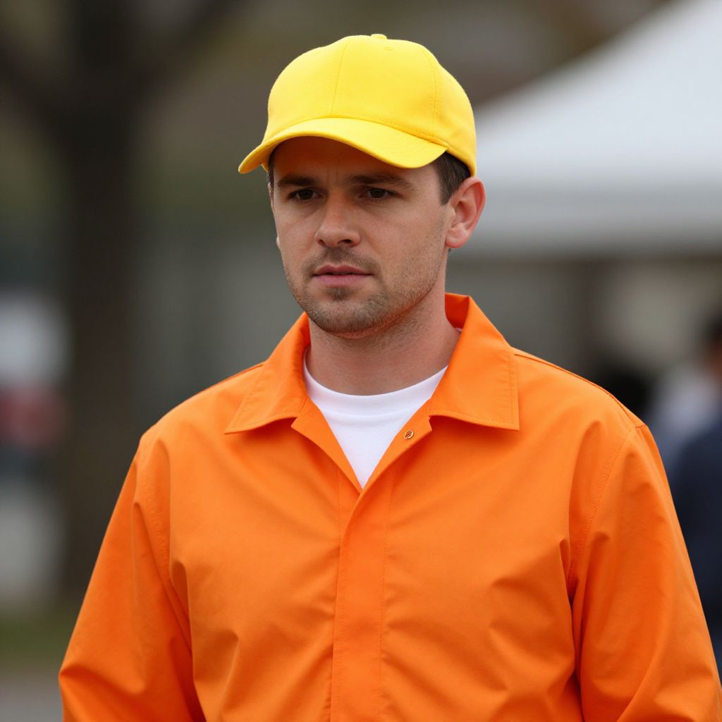 "Worker Bee Costume, man in an orange jacket and a yellow hat"