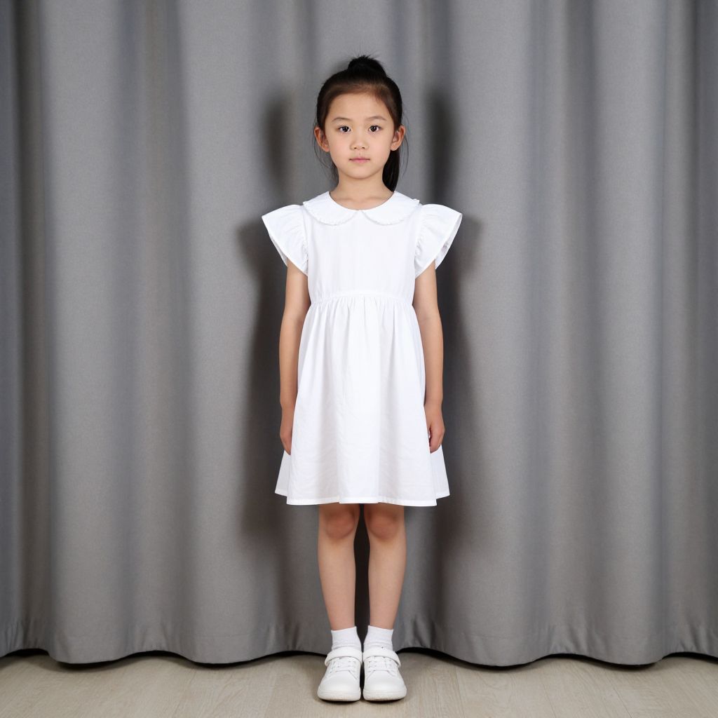 Photograph of an Asian young girl with straight black hair in a small ponytail, standing against a grey curtain backdrop. She wears a simple white, short-sleeved dress that reaches mid-thigh and white sneakers. Her skin tone is light, and she stands with a neutral expression, arms slightly away from her body. The floor is light-colored wood, and the lighting is even, highlighting the plain, minimalist setting.