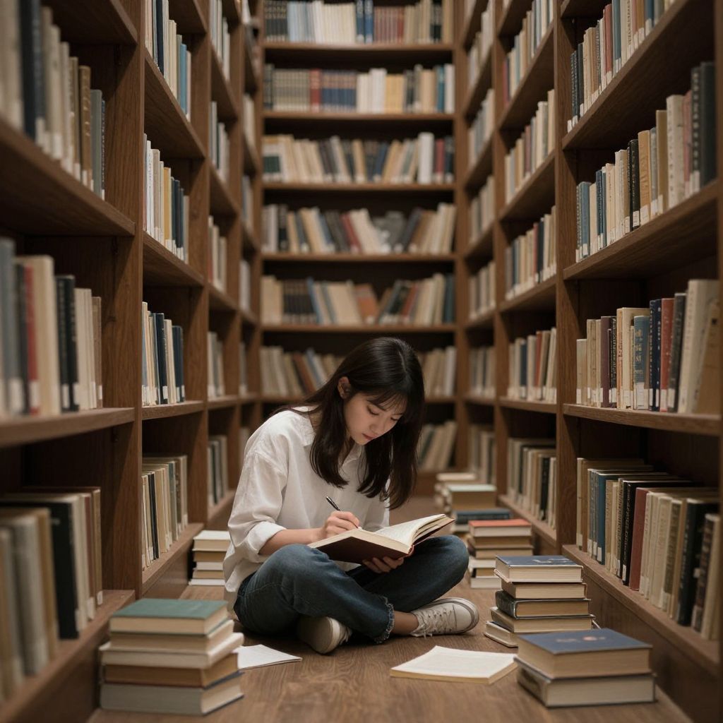 Serene young woman engrossed in reading and writing within a vast, dimly lit library, surrounded by towering wooden shelves filled with countless books, while scattered volumes rest on the floor around her.
