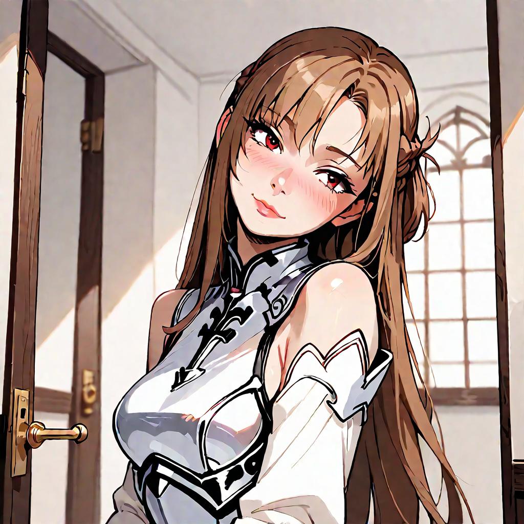 Score_9, score_8_up, score_7_up, score_6_up, yuuki asuna, brown eyes, brown hair, long hair, bangs, braid, skinny, slender body, tiny, medium breasts, red pleated skirt, white detached sleeves, bare shoulders, white thighhighs, white armor, white breastplate, A girl leaving the room, indoors, bedroom, door, open door, (nose blush:1.1), (head tilt:1.2), hollow eyes, half-closed eyes, (looking away:1.2), closed mouth, upper body, from behind, masterpiece, best quality