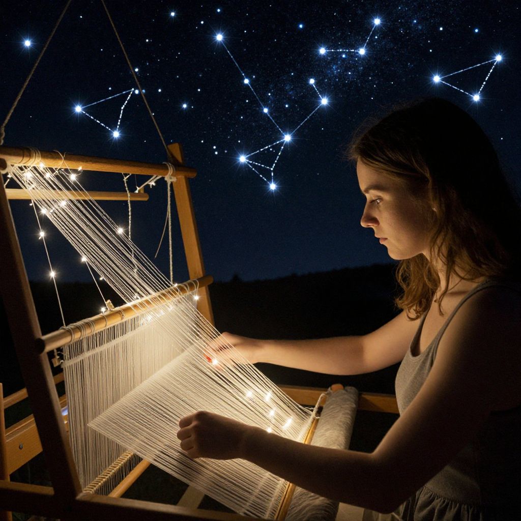 A woman threads luminous strands of light through a loom, weaving a tapestry where each stitch illuminates the night sky outside, transforming it into a canvas of shimmering constellations.