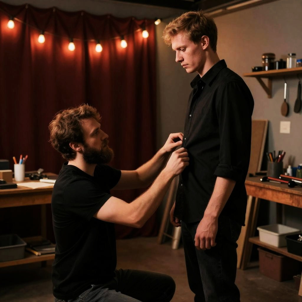 Photograph of two men in a dimly lit workshop. Bearded man kneels, adjusting a black shirt on a tall, fair-haired man. Warm, red curtains and string lights in background. Workbench with tools and supplies on the right. Intense expressions.