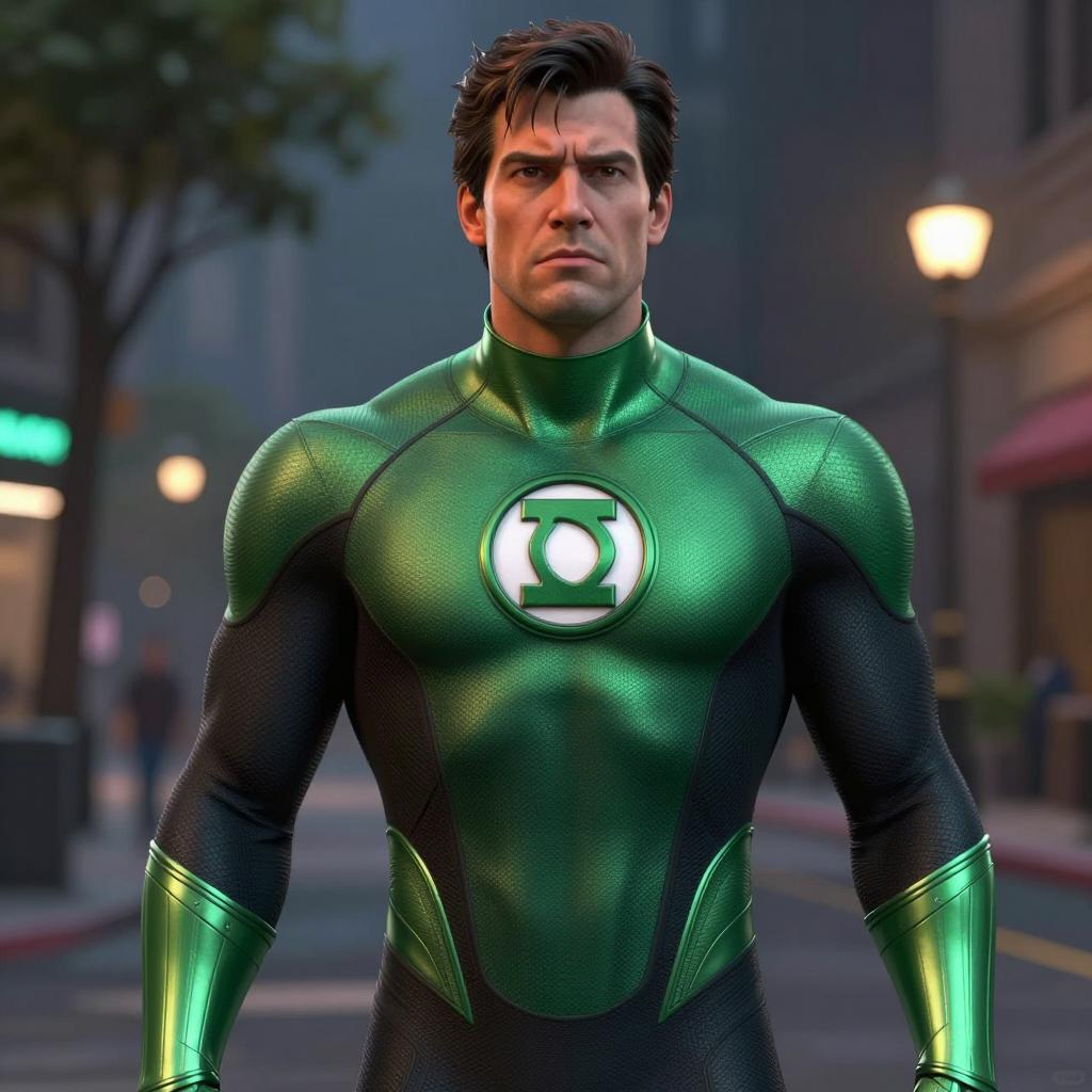 Shego boy costume, photorealistic, male superhero, standing, green and black tight suit, muscular build, green bat symbol on chest, dark hair, forest background, sunlight filtering through trees, archway in background, serious expression, CGI, green, black, black leggings, realistic ures, detailed clothing, lighting, green forest, fantasy setting, digital art, T2I model, DC Comics character