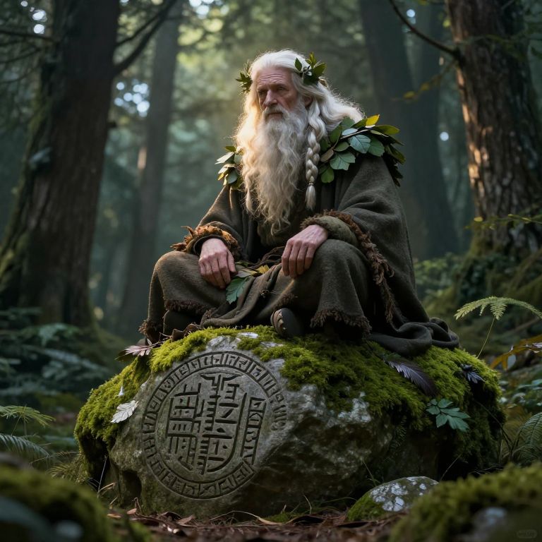 A peaceful firbulg elder sitting atop a moss-covered stone, surrounded by ancient runes carved into the forest floor, wise expression with long braided hair intertwined with leaves and feathers, a gentle glowing aura illuminating the surrounding forest setting, fantasy art with intricate detail.