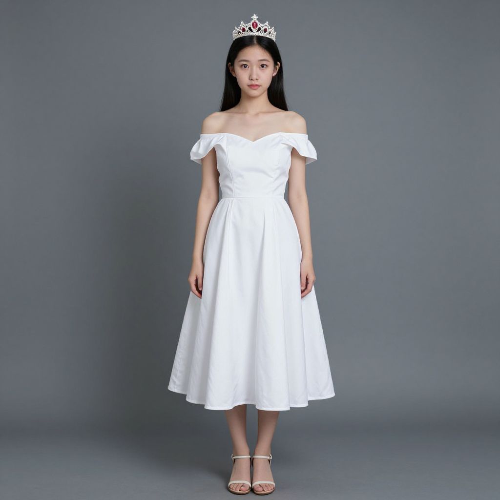 Female wearing a green and white dress with a red sash and a green headband.