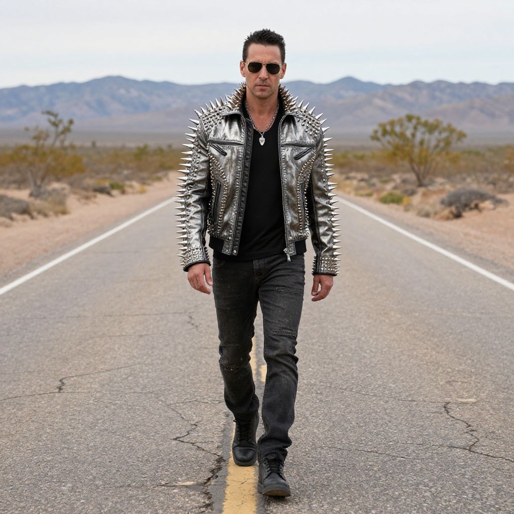 A confident man walks down a cracked desert road surrounded by sparse vegetation and distant mountains. He wears a striking metallic jacket adorned with prominent spikes, exuding a bold, edgy style against the rugged natural backdrop.