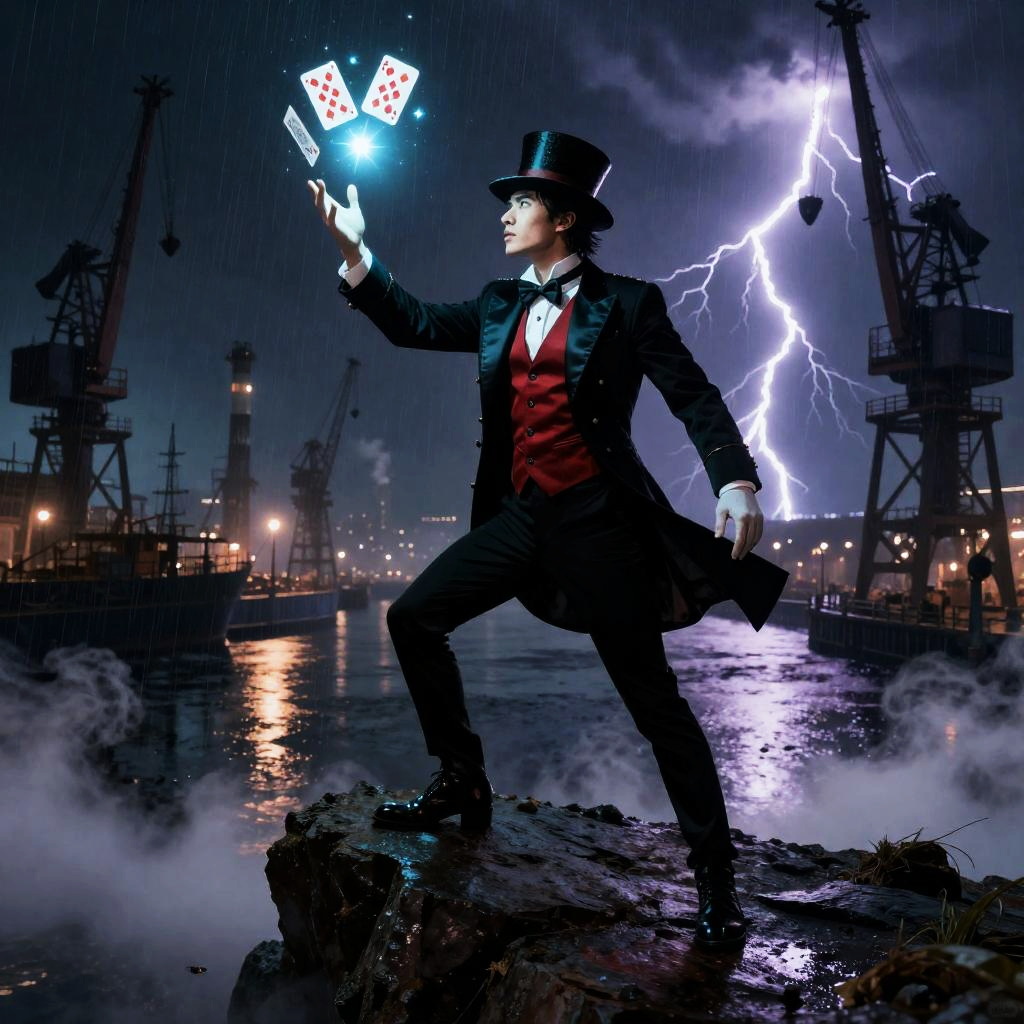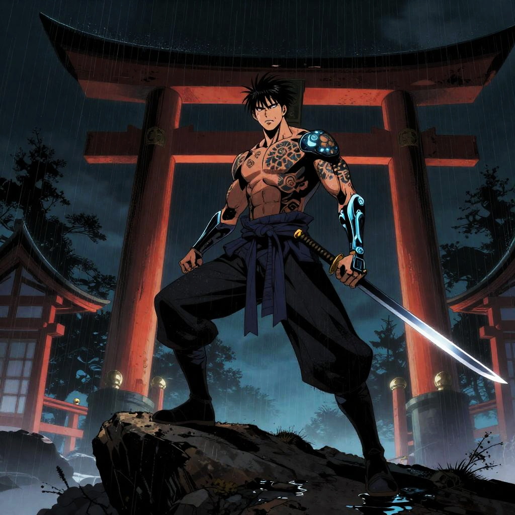 Modern comic book style illustration of a ninja assassin standing triumphantly on a rocky cliff, holding a katana. The character has long black hair, muscular build, and wears a dark blue outfit with a red sash. Dramatic swirling storm clouds and lightning illuminate the powerful scene.