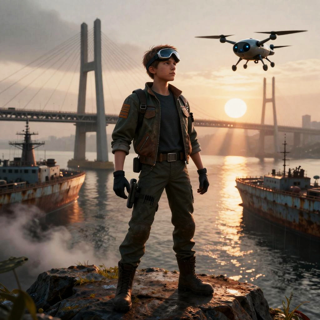 Modern comic book image in the style of Dan Mora depicting a ninja assassin with a striking katana standing triumphantly on a rocky cliff, with a swirling storm cloud casting dramatic light over the scene.