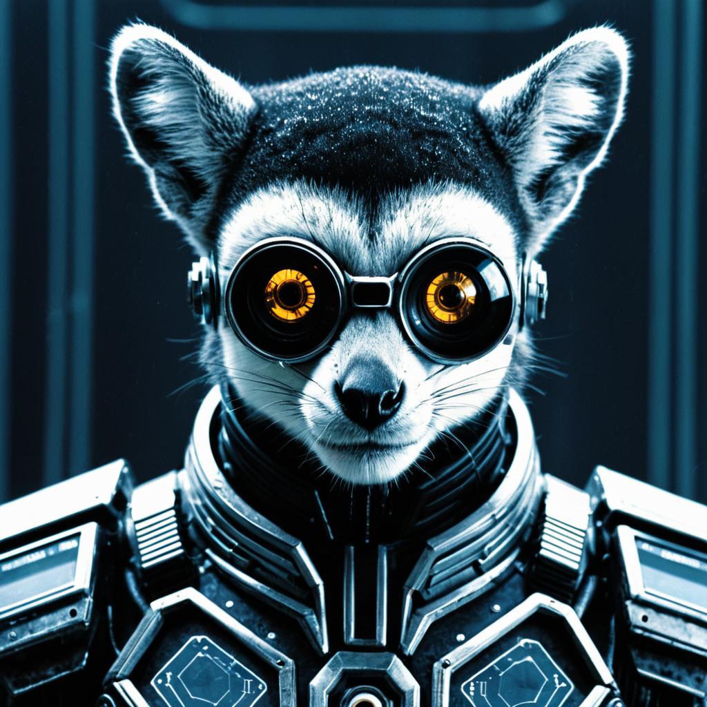 High-tech cyborg robot resembling the T1000 from the film Judgment Day, featuring a sleek metallic body with glowing orange eyes and intricate mechanical details. The robot has a black and silver armor design with futuristic aesthetics against a dark background.