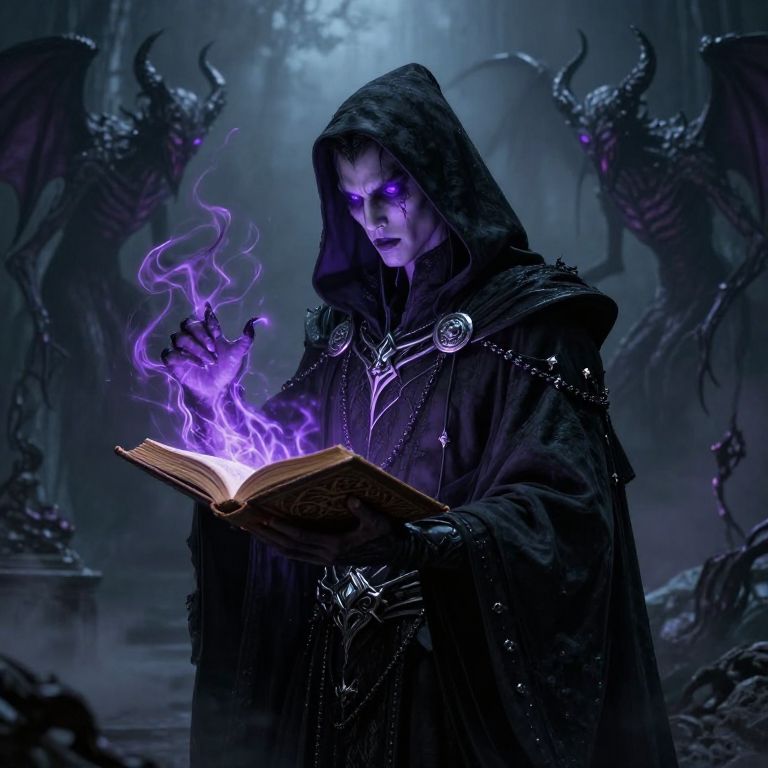 Mysterious hooded sorcerer in dark robes conjures purple flames from an open book, surrounded by shadowy, horned demons in a dim,