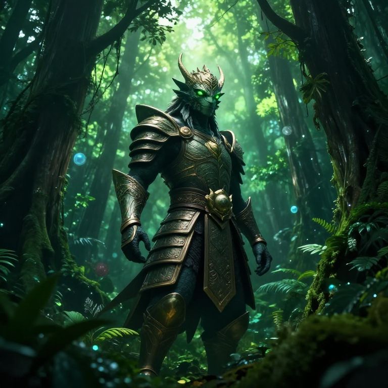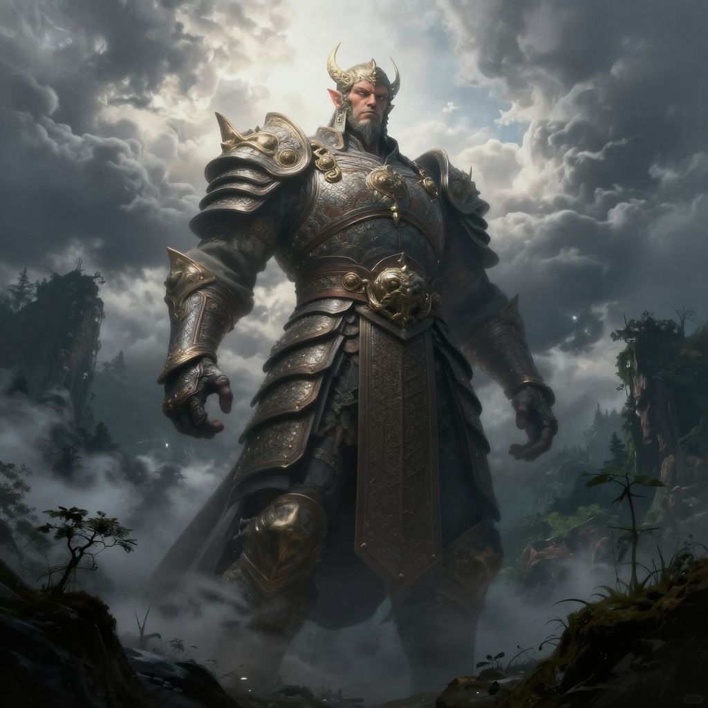 Tonico as a mythical creature in a fantasy landscape, adorned with intricate armor and surrounded by lush forests and magical mist, dramatic lighting highlighting textures, inspired by high-fantasy illustration style with detailed backgrounds.