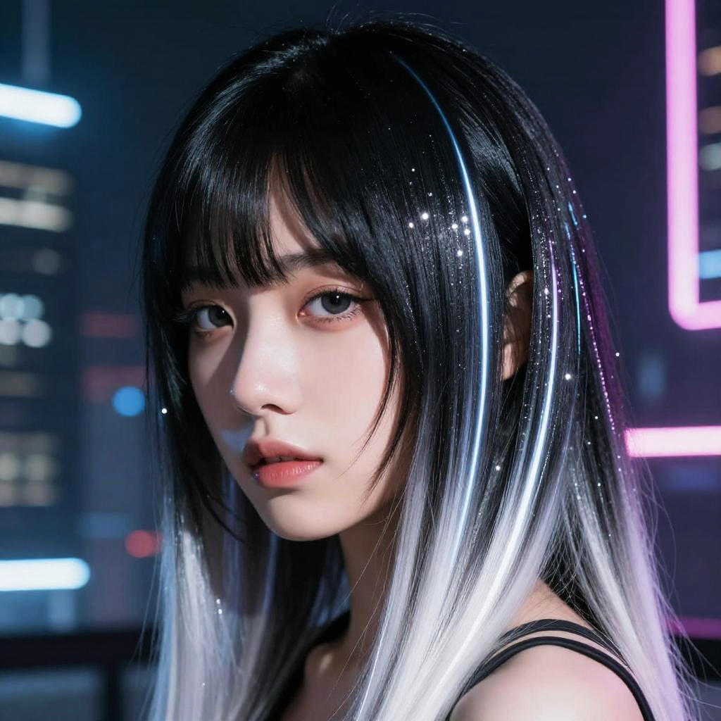 Green and dark brown hair styled in an avant-garde fashion, with geometric shapes and metallic accents, futuristic background with neon lights and holographic effects, a striking blend of organic and high-tech aesthetics in a bold composition.