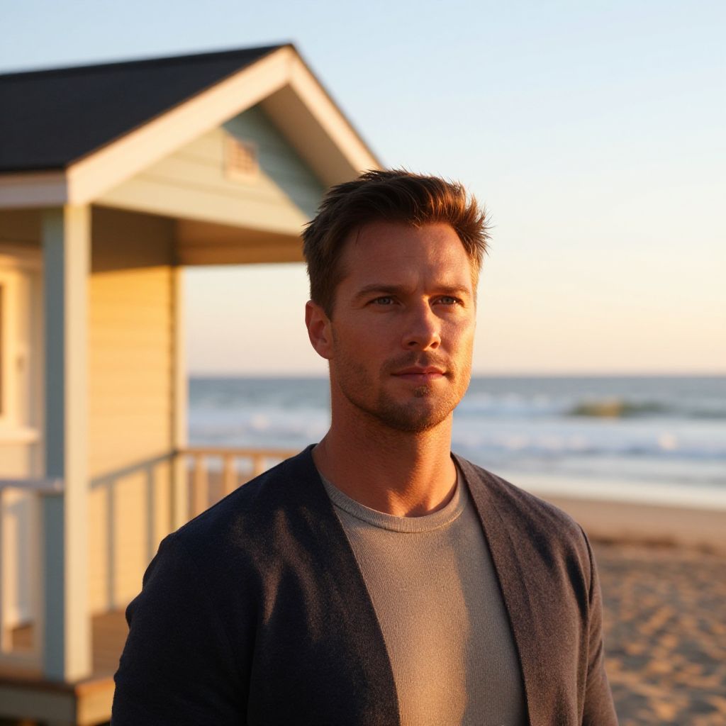Serene coastal scene: A man stands proudly outside his charming beach house, surrounded by lush greenery, tranquil waves crashing against the shore, soft golden hour light illuminating the idyllic atmosphere, warm hues dancing across the wooden exterior, inviting tranquility. Man has masculine face and piercing eyes