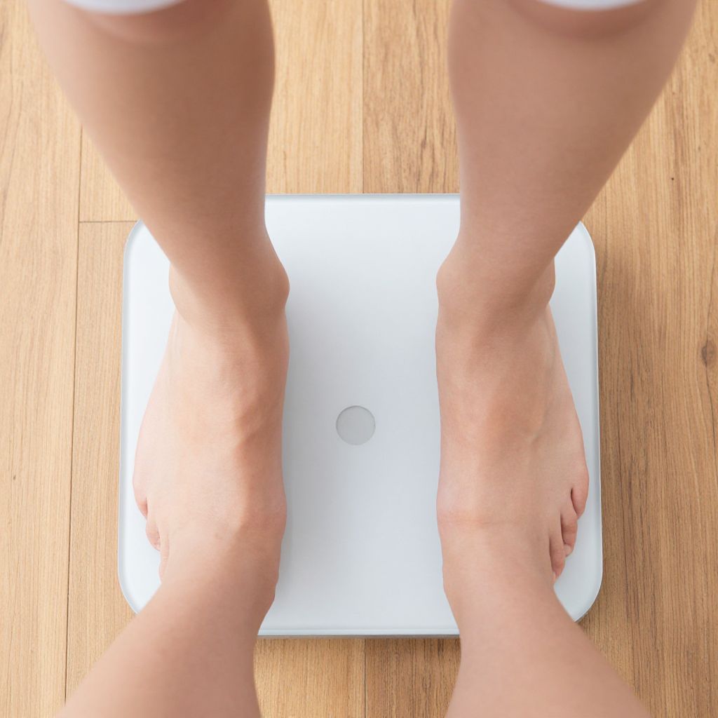 Photograph of a person's bare feet standing on a white digital scale with a central circular button, on a wooden floor.