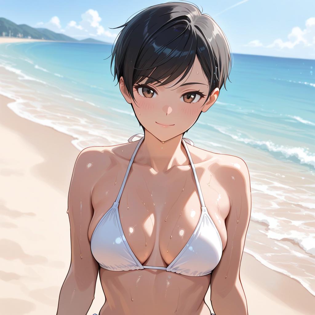 1girl, white bikini, (medium breasts:1.1), black hair, looking at viewer, standing, (swept bangs:1.3), (very short hair, tomboy:1.1), smile, arms at sides, upper body, beach, sweat