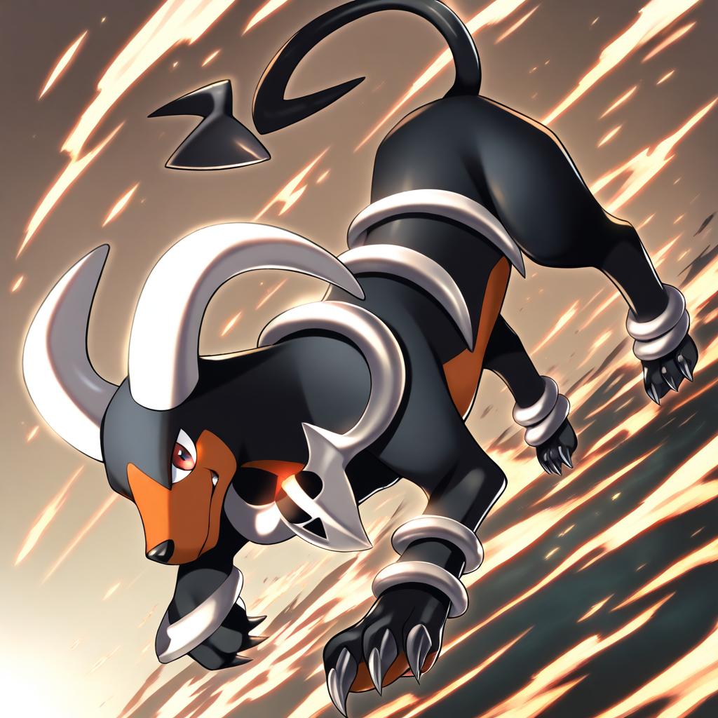 Houndoom, pokemon, no humans, horns, red eyes, black hair, pokemon (creature), claws, by artist hinoue itaru, animagine