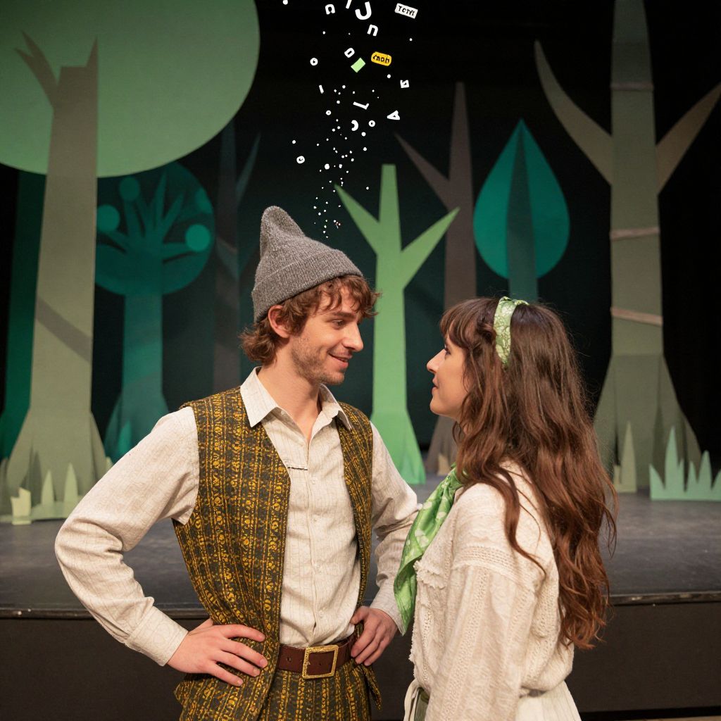 Photograph of a stage play featuring a smiling white man with curly brown hair, wearing a grey knit hat, white shirt, and brown tweed vest with a yellow pattern, standing beside a white woman with long brown hair, a green headband, and a white blouse with a green scarf. The background shows a dark forest set with green and black trees. The man's hand rests on his hip while the woman looks up at him. Bright, small lights float above their heads, adding a magical touch. The actors exude a playful, romantic vibe.