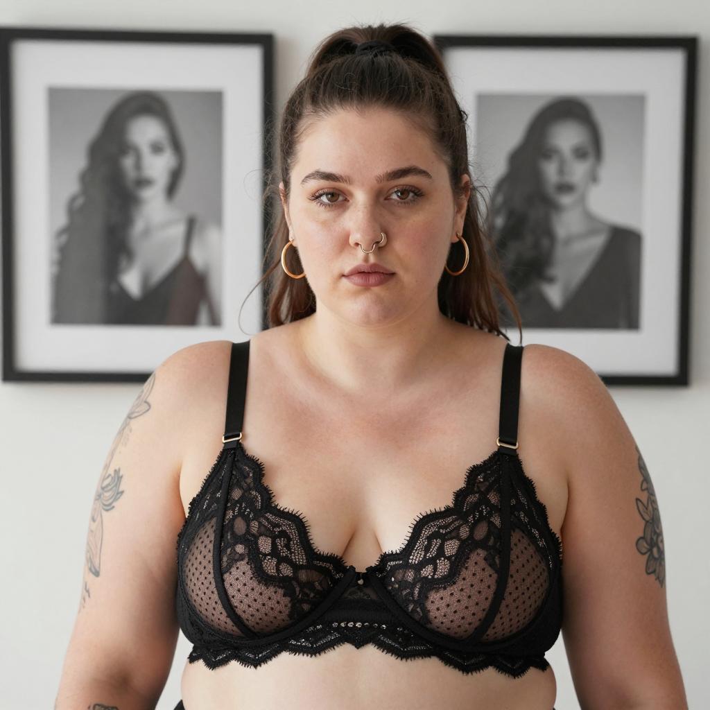 Plus-sized woman with long brown hair, wearing black lace bra, holding smartphone, smiling widely. She has hoop earrings, a tattoo on her right side, and fair skin. Background includes a white lamp and a gray couch. Photographic style.