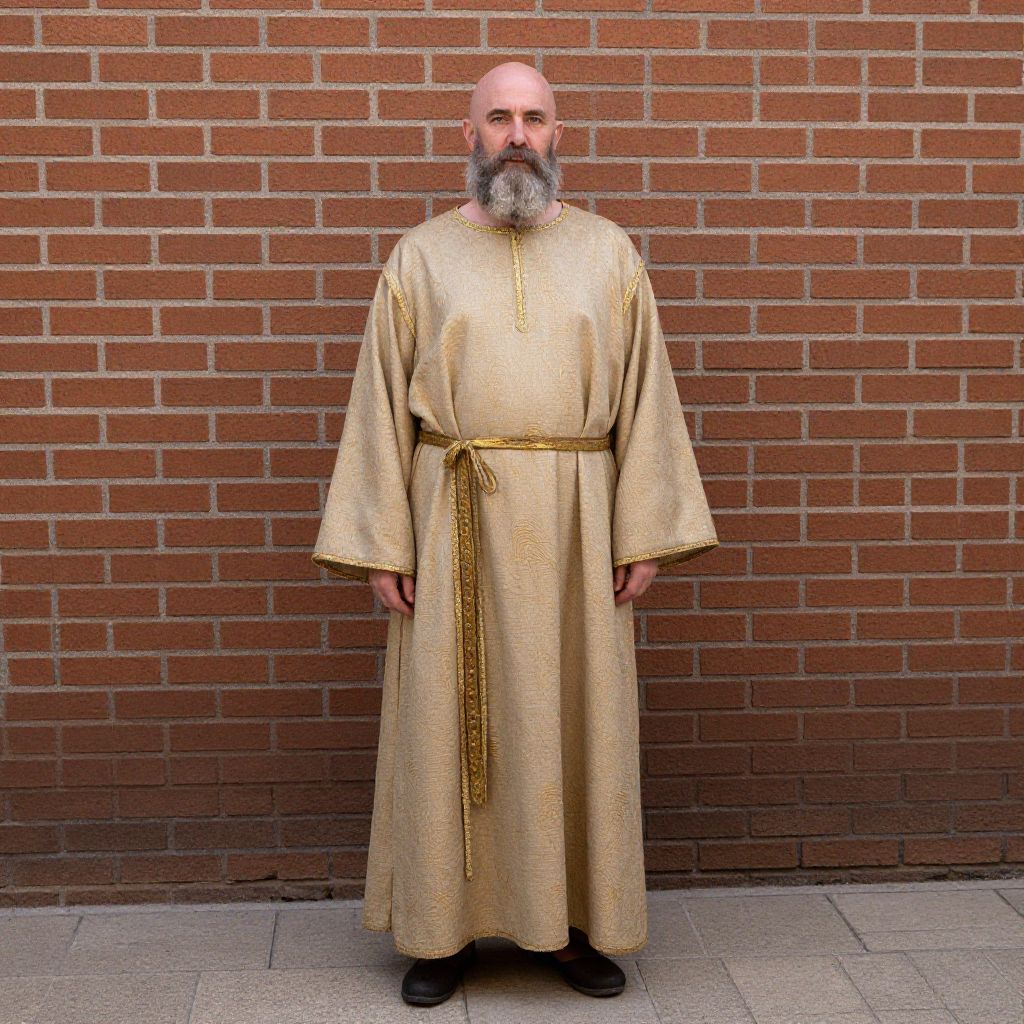 Photograph of a bald, middle-aged man with a full, gray beard standing against a red brick wall. He wears a long, golden-brown, ornate robe with a gold-trimmed belt and black shoes. The robe has a slightly textured, embroidered pattern. The man stands with his arms relaxed at his sides, looking directly at the camera. The brick wall behind him is uniformly red with white mortar, and the ground is a light gray, tiled pavement. The image has a slightly warm color tone.