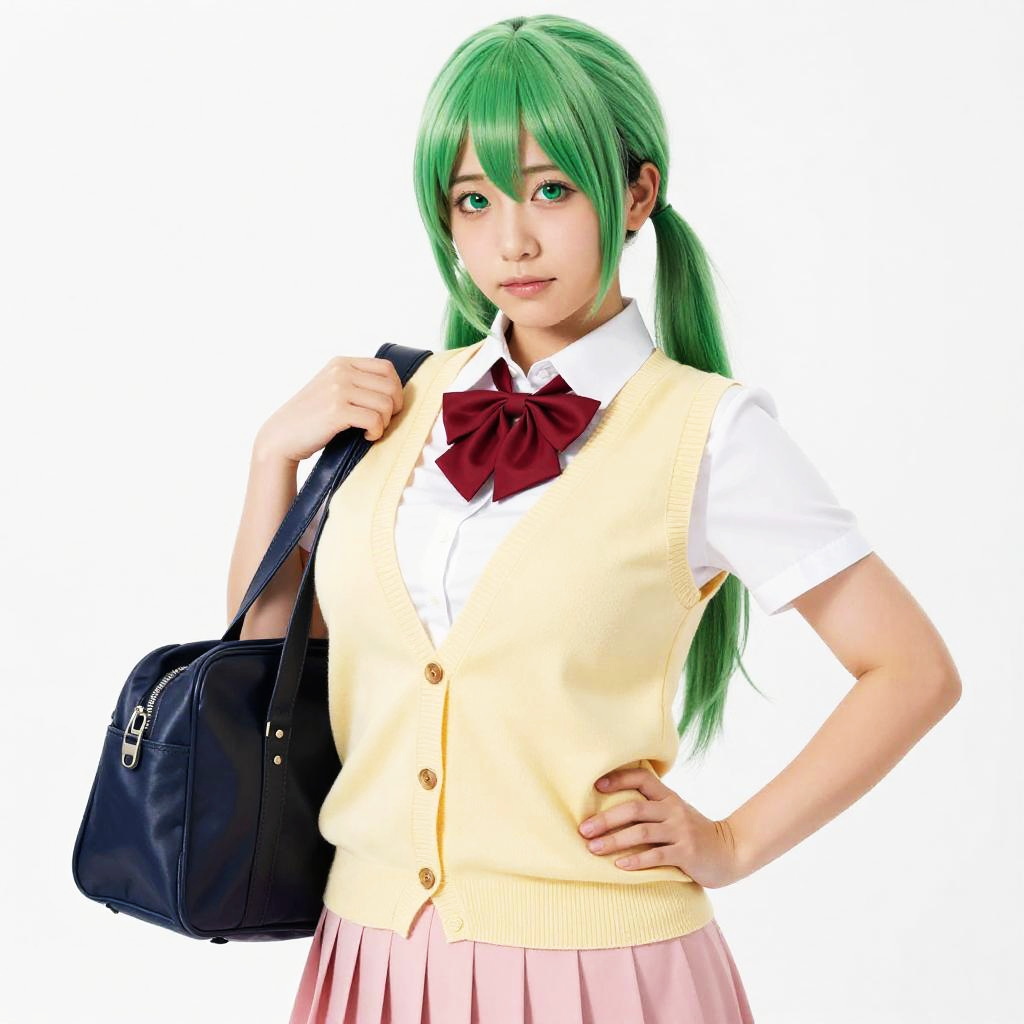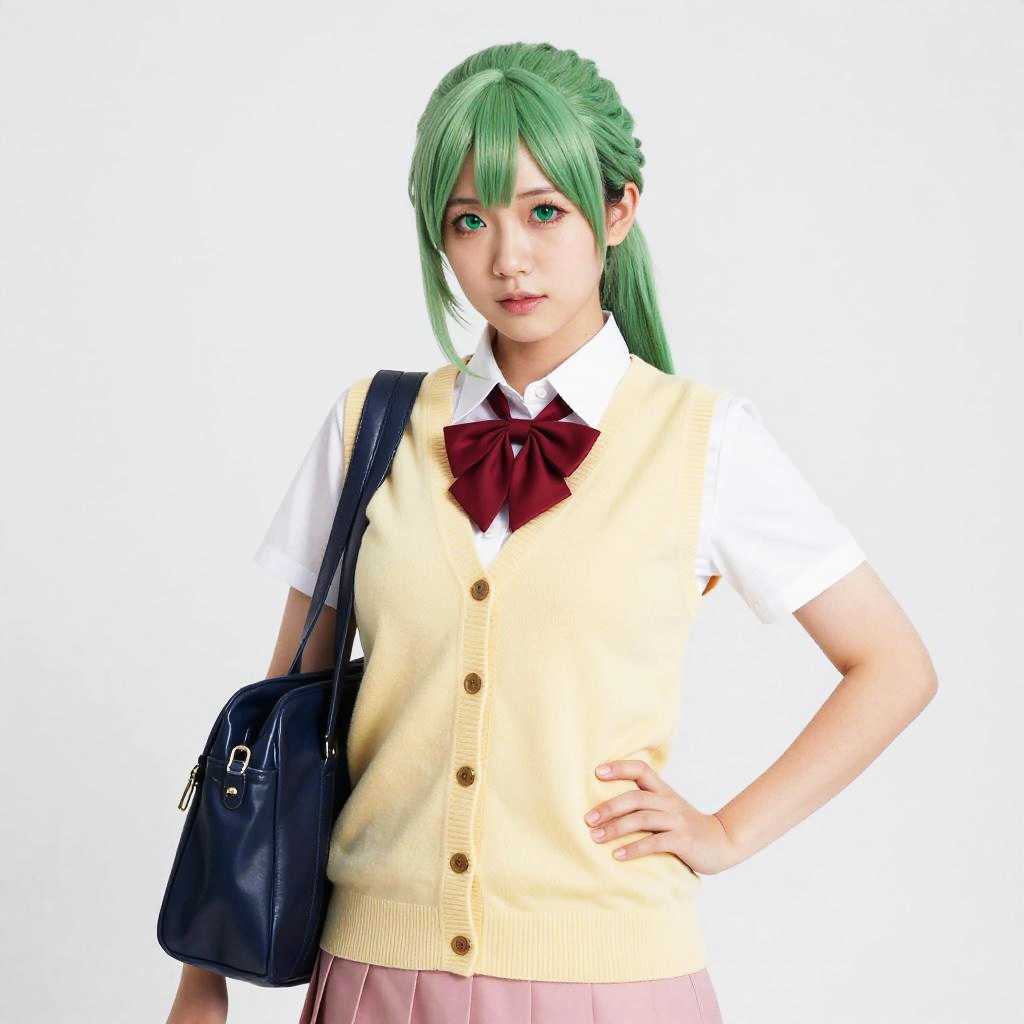 Score_9, score_8_up, score_7_up, best quality, masterpiece, realistic, gigantic breasts, upper body, 1girl, sonozaki mion, solo, necktie, green eyes, green hair, long hair, bag, red necktie, skirt, ponytail, vest, yellow vest, shirt, white background, simple background, school uniform, hand on hip, white shirt, short sleeves, looking at viewer, open vest, pink skirt