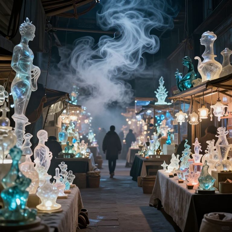 A luminous, otherworldly marketplace bathed in ethereal light, where glass displays overflow with glowing, translucent sculptures that seem to pulse with life, while swirling clouds of smoke drift through the air like living, shifting forms.