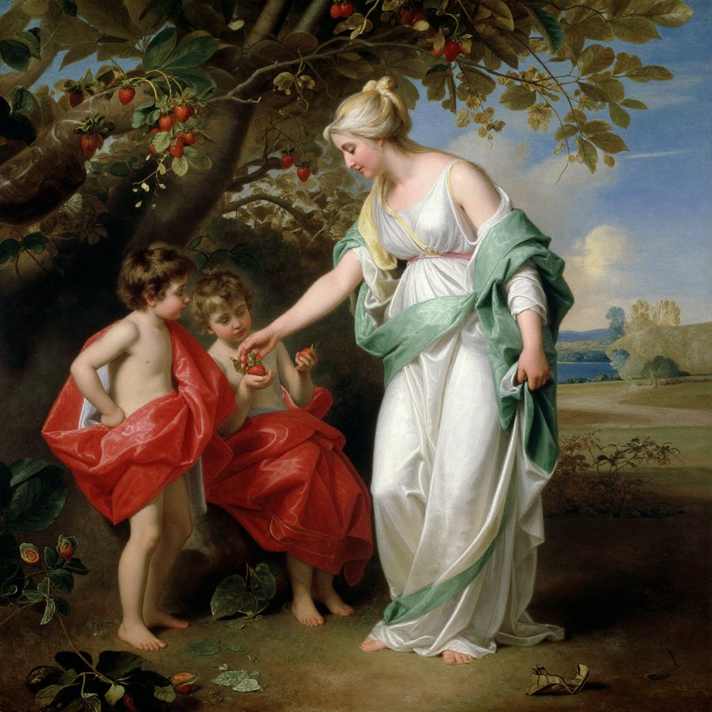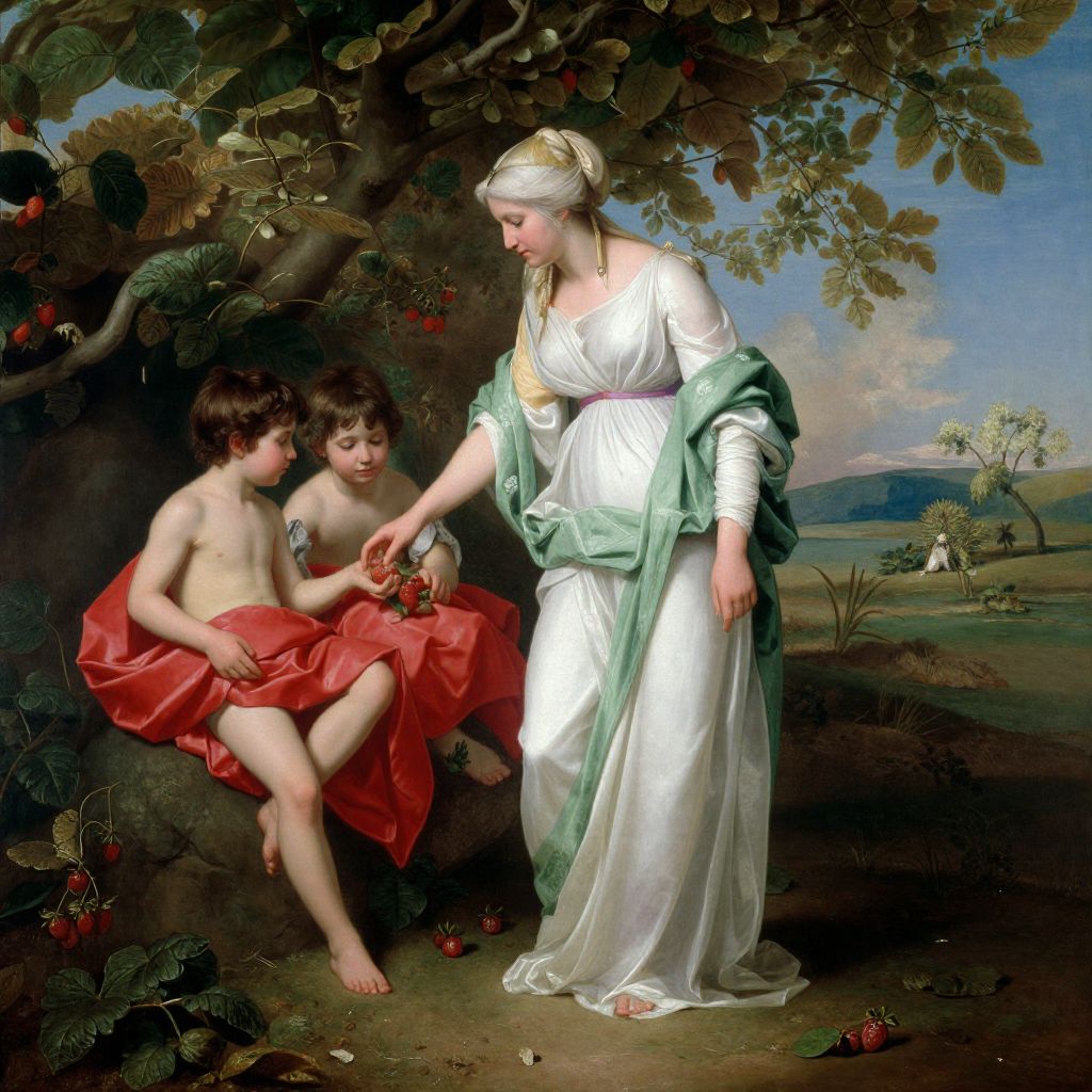 Francois Boucher's serene pastoral scene depicts a woman in flowing white and green robes tenderly interacting with two children, one draped in a vibrant red cloth, as they gather strawberries amidst lush foliage and a tranquil landscape.