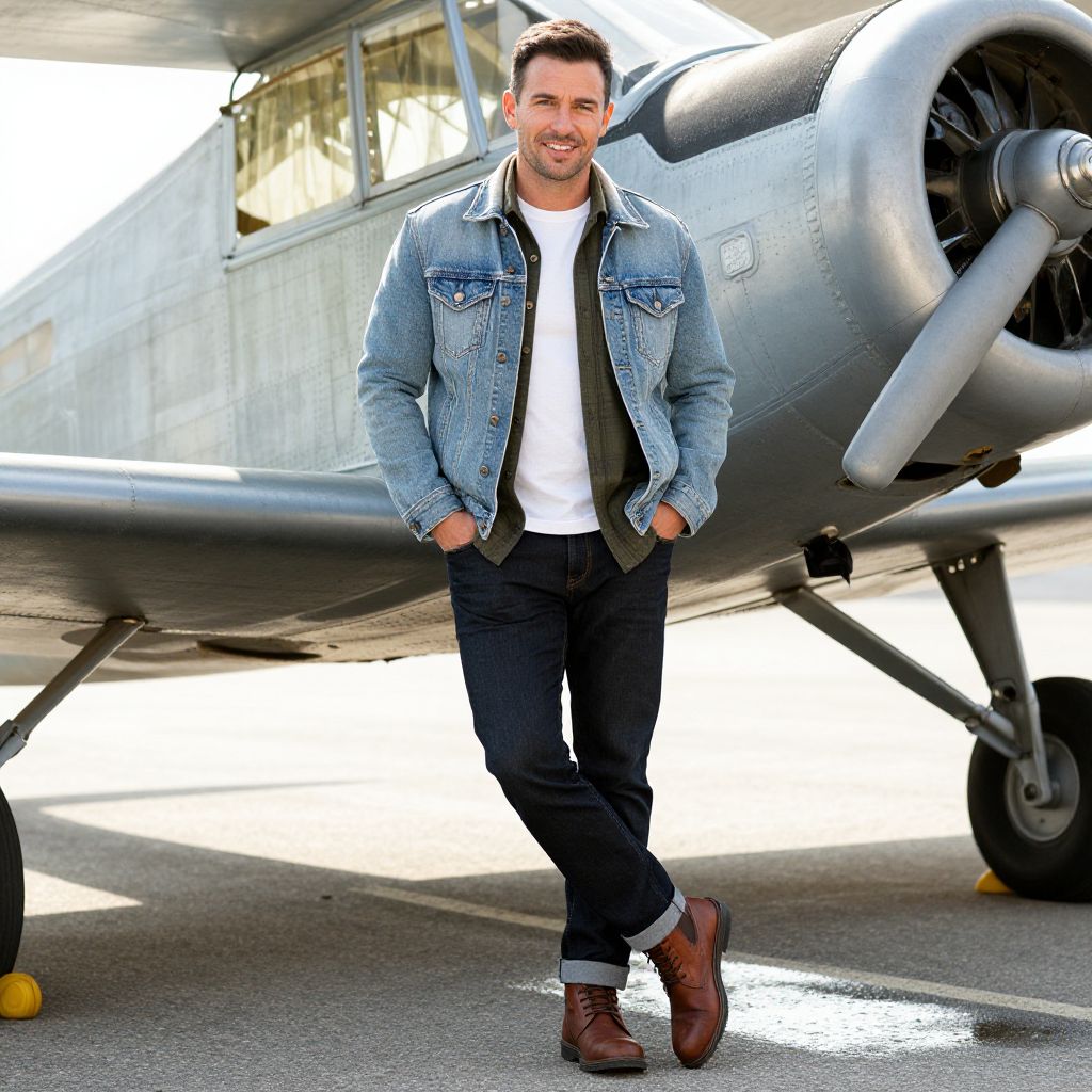 A man, casual urban look, lightweight denim jacket, white cotton t-shirt, olive green flannel shirt, dark slim-fit jeans, brown leather boots, tarmac glistening under the sun, cinecolor, leaning against a vintage plane, relaxed smile, hands in pockets.Man has masculine face and piercing eyes