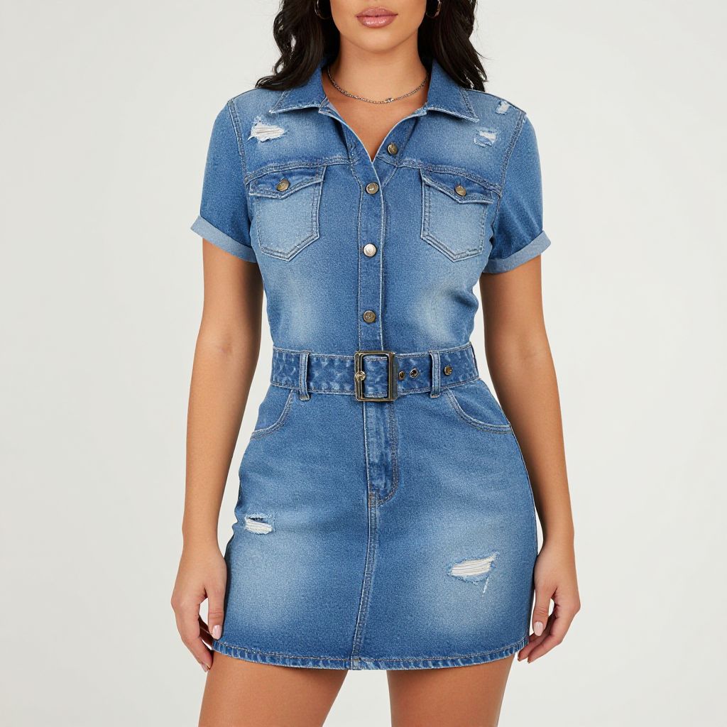 Photograph of a woman with light brown skin and wavy dark brown hair, wearing a short-sleeve, button-up, blue denim dress with distressed patches on the chest and hem. The dress has a belted waist with a buckle and features two chest pockets with small buttons. She has pink lipstick and a subtle gold necklace. The background is plain white, making the blue denim dress the focal point. The dress fits snugly, accentuating her figure.