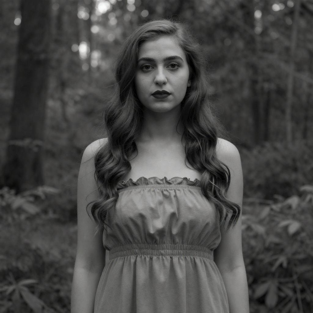 Photograph of a young woman with long, wavy brown hair, wearing a white, slightly dirty shirt, standing behind a rusty, broken window frame. She gazes intently forward, hands gripping the frame. Background: blurry forest with tall trees. Green leafy branch on the right.