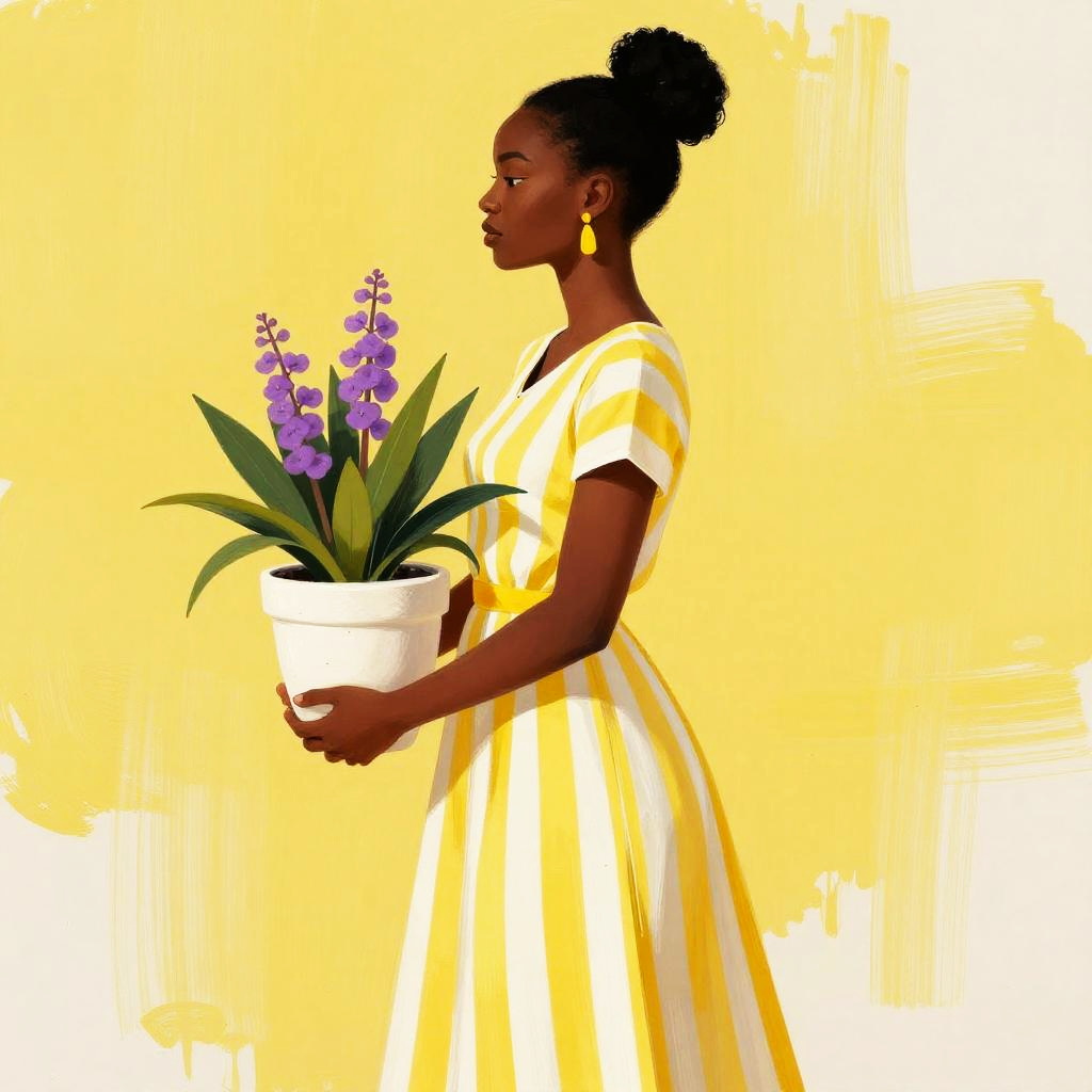 This is a digital painting of a black woman in profile, standing against a yellow and white background. She's wearing a yellow and white striped dress with short sleeves and holds a white, textured pot with green leaves and purple flowers. Her silhouette is black, and she has her hair in a bun. She's wearing yellow earrings, adding a touch of elegance. The overall style is modern and vibrant.