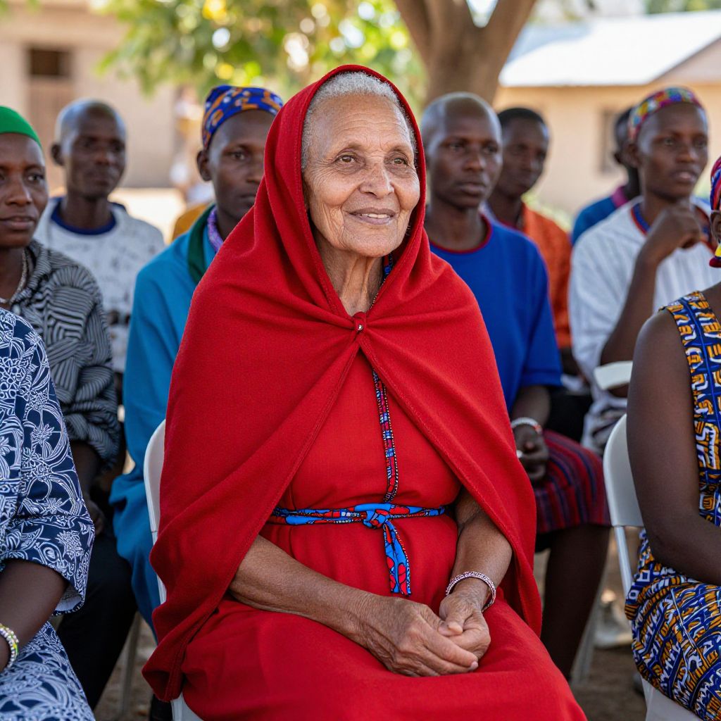 Elderly woman in vibrant red attire smiles warmly while seated among other community members during a gathering at Maji Moto, advocating for women's empowerment and the cessation of FGM within the Maasai community.