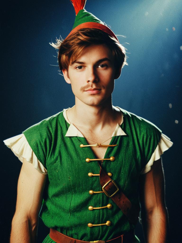 Man in Disney Peter Pan Costume, waist-up editorial portrait, photorealistic tones