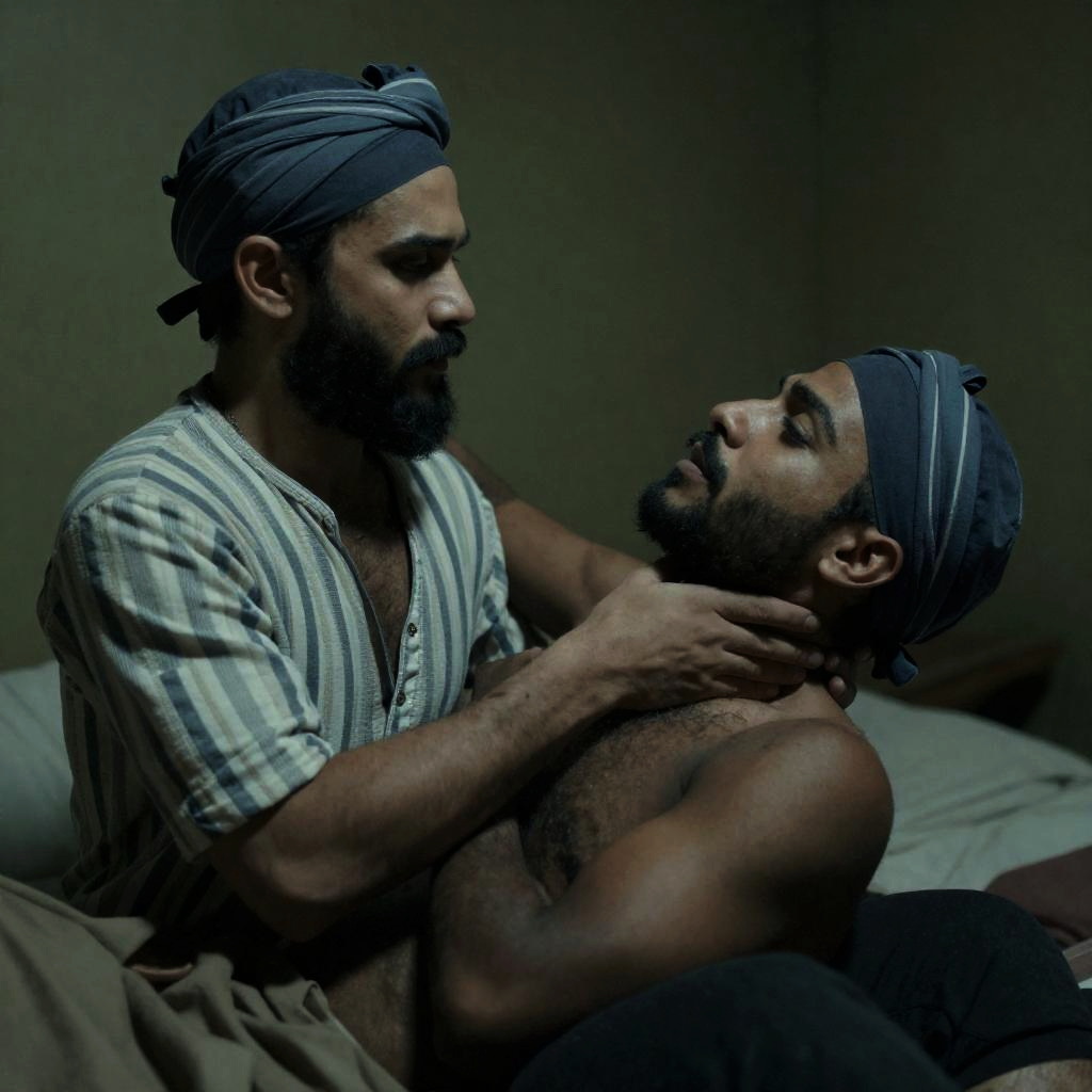 Photograph of a scene in a grassy, outdoor setting. A man with red hair, wearing a dirty white shirt and pants, kneels beside a shirtless, unconscious man on the ground. Another man with a white headscarf, also in a white shirt, sits nearby. Several other people stand in the background. The red-haired man's face shows concern. The background includes greenery and tree trunks.