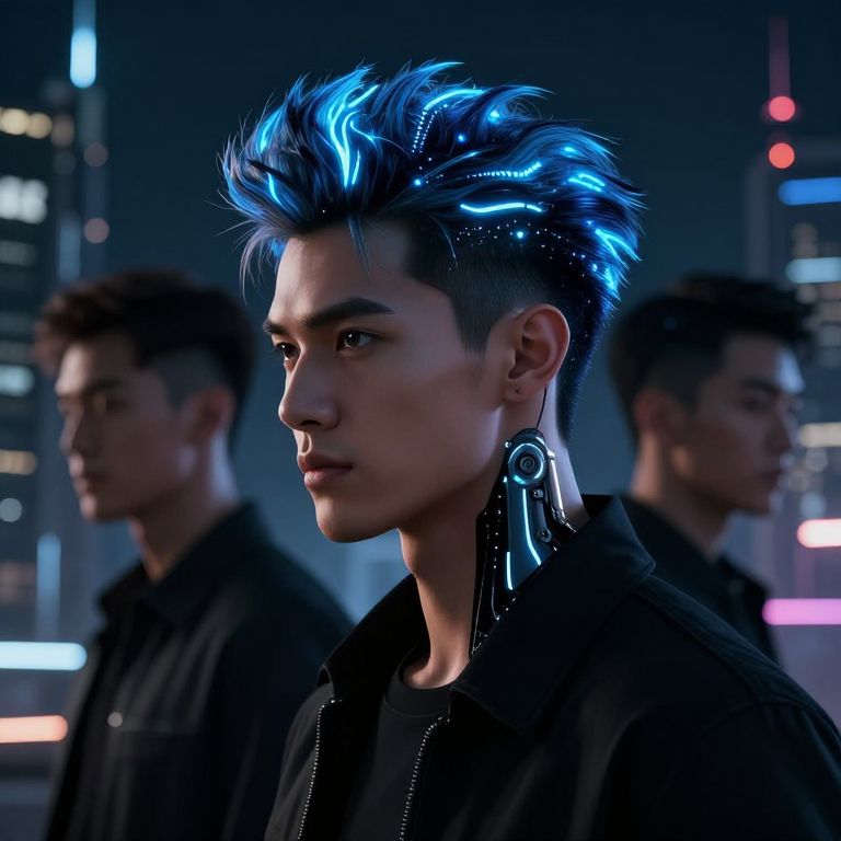 A digital artwork depicts a young Asian man with striking electric blue, neon-styled hair and cybernetic earpiece. His hair is spiky and illuminated with bright blue lights. He wears a black shirt and is in profile, facing left. Two blurry figures, also Asian, with similar dark hair and black clothing, stand behind him. The background is a night cityscape with blurred lights and buildings, creating a futuristic, cyberpunk atmosphere. The image uses a high-contrast, hyper-realistic style with a focus on neon lighting and cybernetic elements.