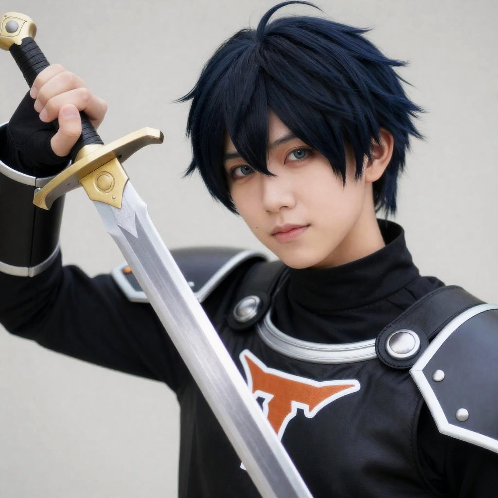 Close-up portrait of a person cosplaying Texas from Arknights, wearing black and gray armor with orange accents, holding a sword with a gold and black hilt. The subject has short black hair and a focused expression, standing against a plain background.