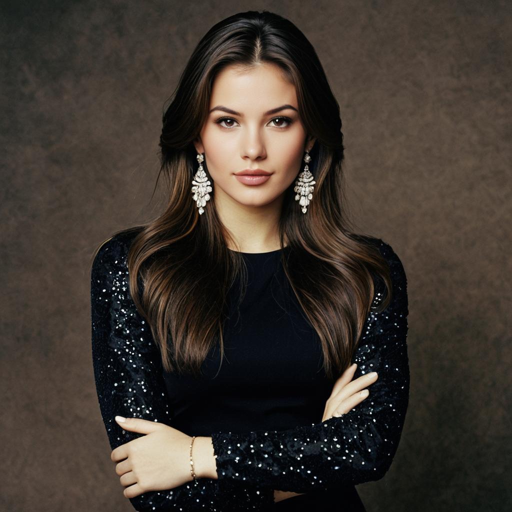 Graceprom woman black long ,1girl, solo, long hair, realistic, jewelry, brown hair, earrings, looking at viewer, arms at sides, brown eyes, long sleeves