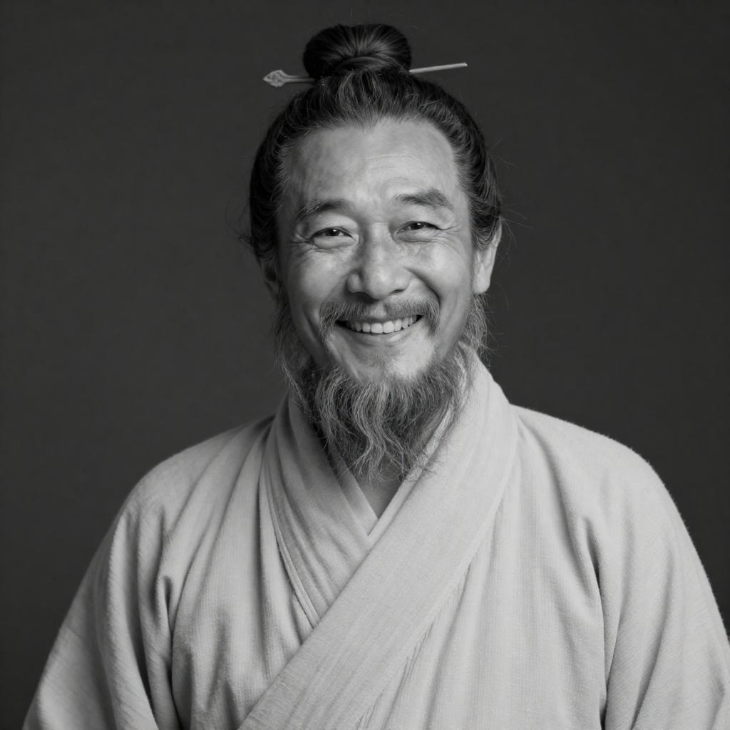 Black-and-white photograph of an older Asian man with a thick beard, smiling broadly. He has a topknot hairstyle and is wearing a light-colored robe with a collar. The background is dark and plain. He is centered in the frame.