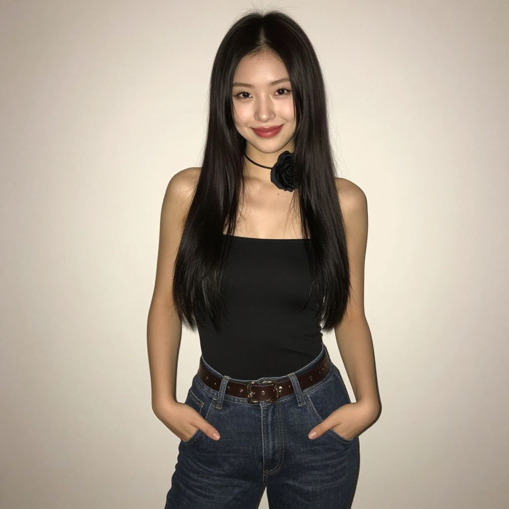 Holiday party outfit theme, 1girl, solo, long hair, realistic, hands in pockets, belt, smile, black hair, lips, choker, flower