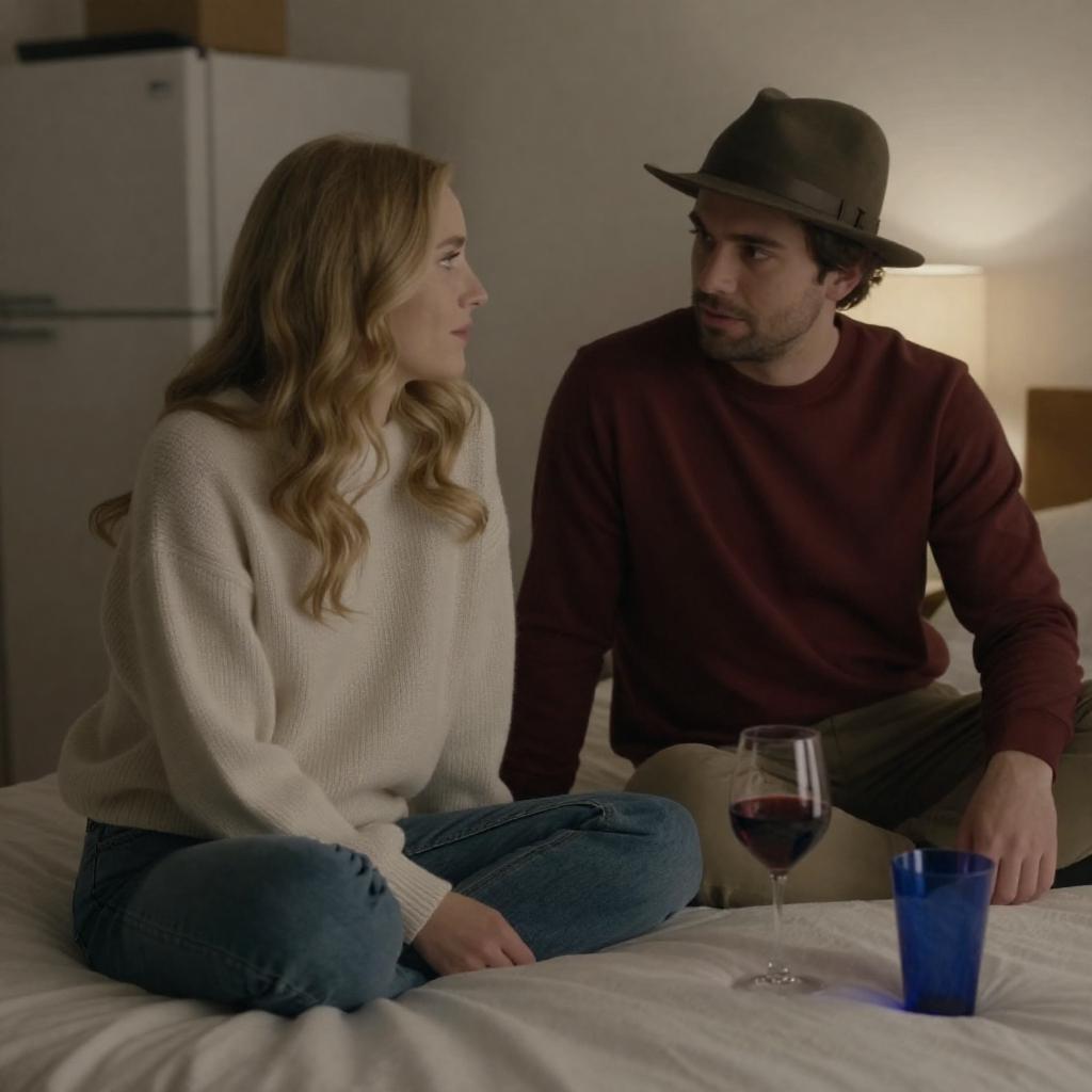 Photograph of a man and woman sitting on a bed, illuminated by soft, dim lighting. The woman with blonde hair and a white, patterned sweater looks to the side, while the man in a red shirt and brown hat gazes at her. A glass of red wine and a blue cup are on the bed. Background includes a refrigerator and a lamp.