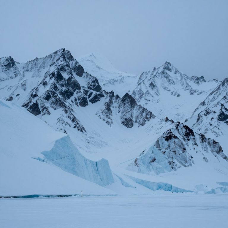 A frozen symphony of silence and memory, where jagged peaks of ice whisper forgotten stories, and each step resonates with the echo of a distant, silent life, evoking a profound sense of isolation and the eternal stillness of time.