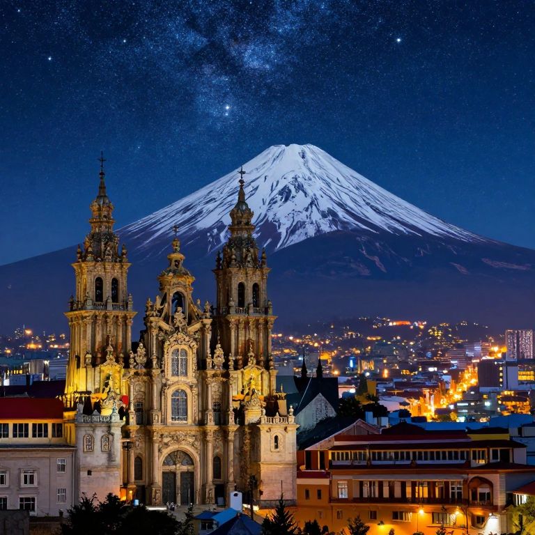 A starry night painting of Santiago de Chile, featuring a snow-capped mountain and illuminated cityscape.
