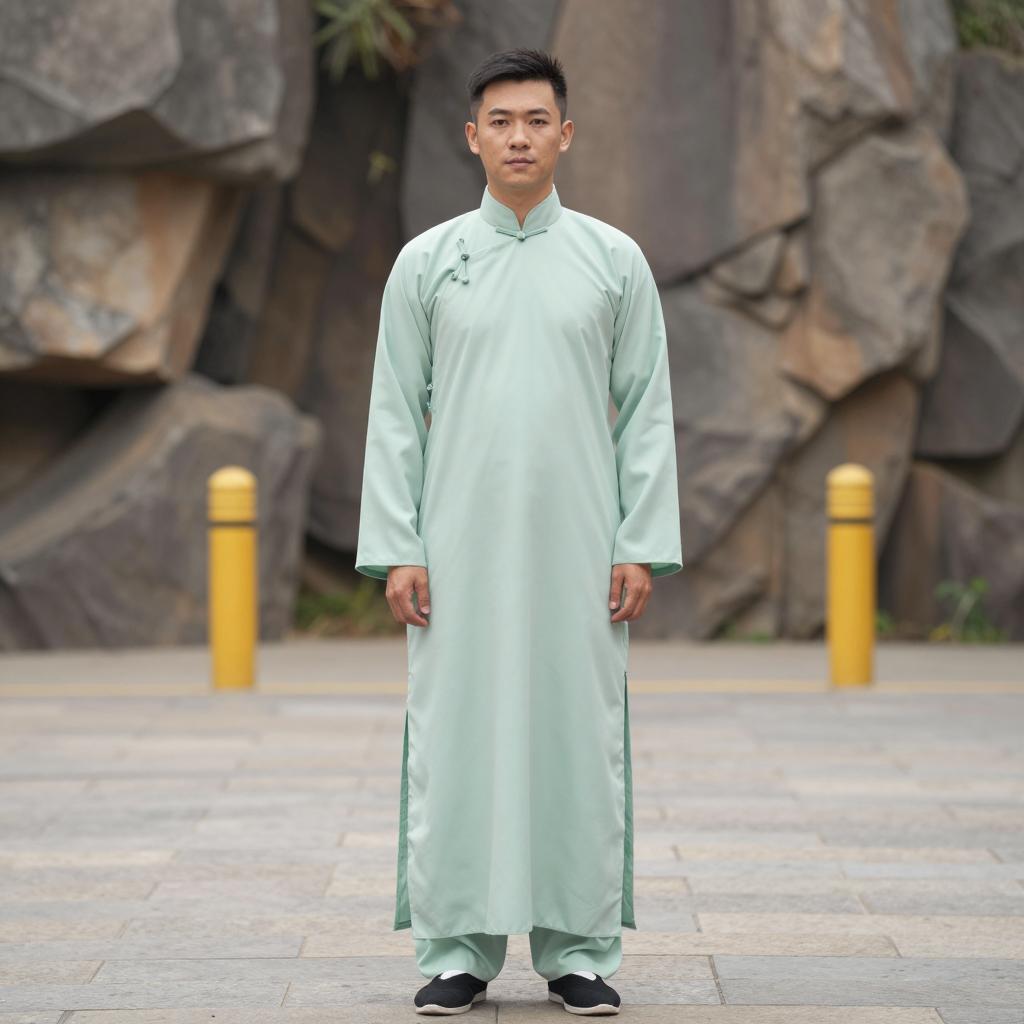 Uzui tengen costume, photo of Asian man standing in traditional Chinese courtyard, wearing blue jacket, red and gold traditional Chinese top, beige pants, red boots, short black hair, serious expression, ornate wooden doors with geometric patterns in background, potted plant on right, natural light, detailed ures, realistic style, historical clothing, traditional Chinese architecture, standing pose