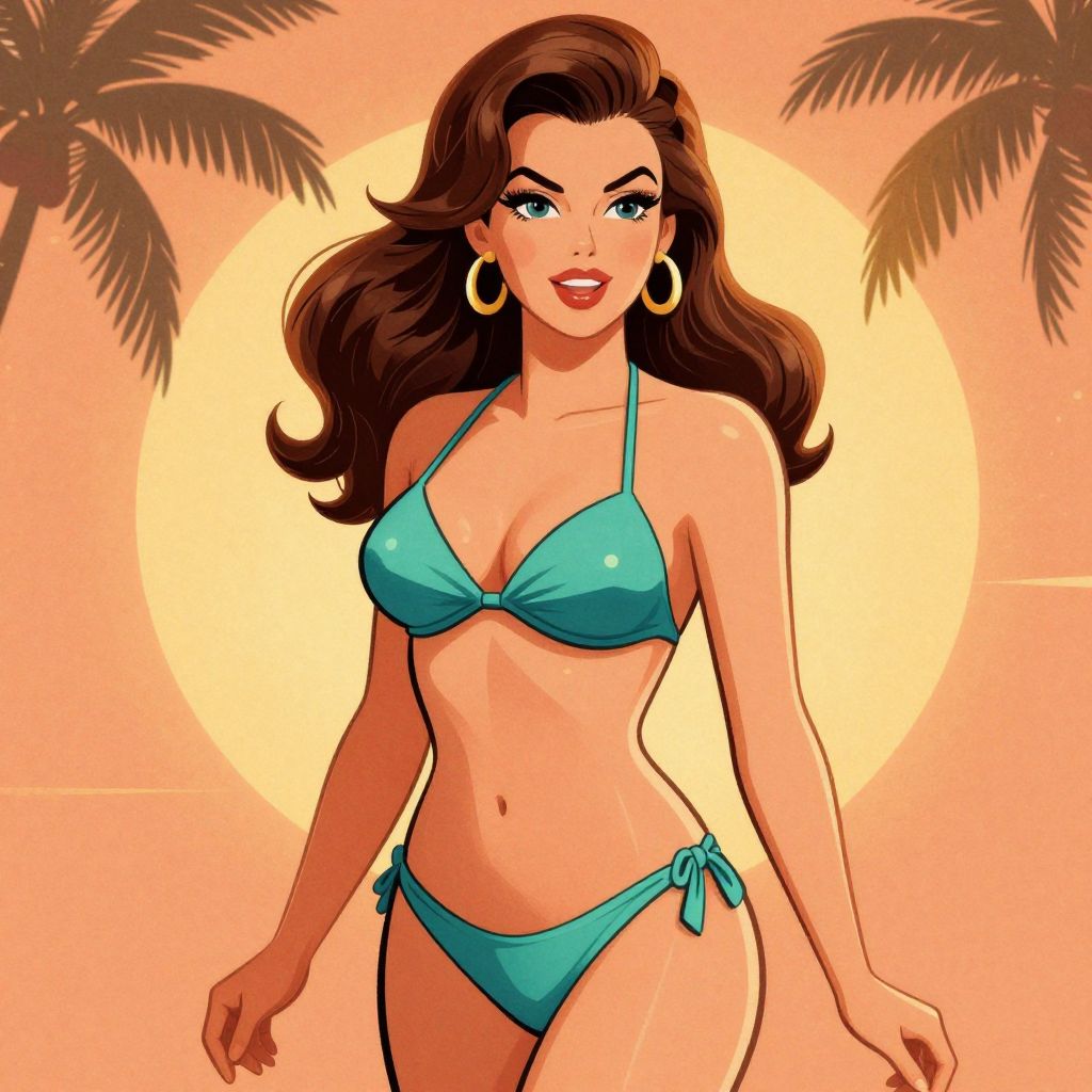 Digital illustration of a smiling, curvy woman with long brown hair, wearing a turquoise bikini, large hoop earrings, and palm trees in the background.