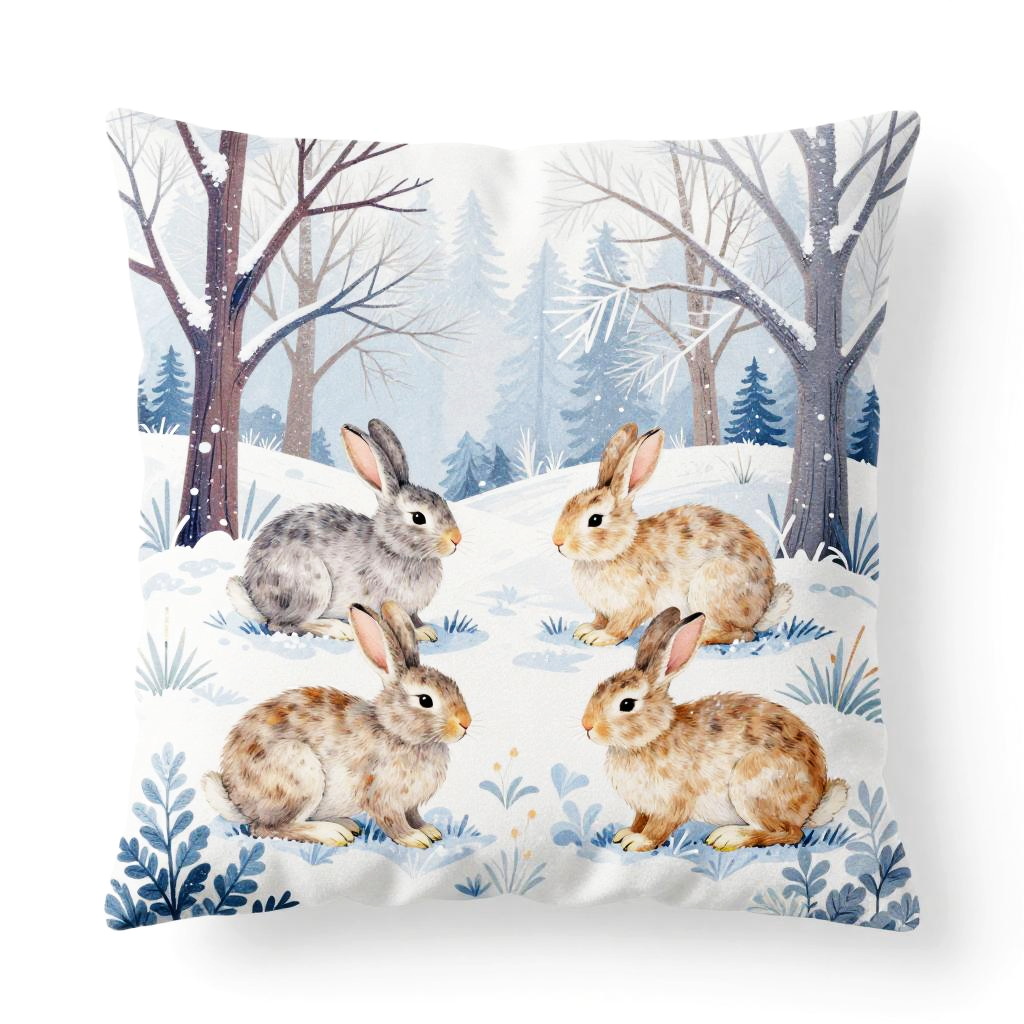 A fabric-effect drawing featuring gentle snow rabbits hopping among frosty trees with soft colors and skin-friendly tones. Designed on a white background, evoking a refreshing and lovely aesthetic with layered elements.