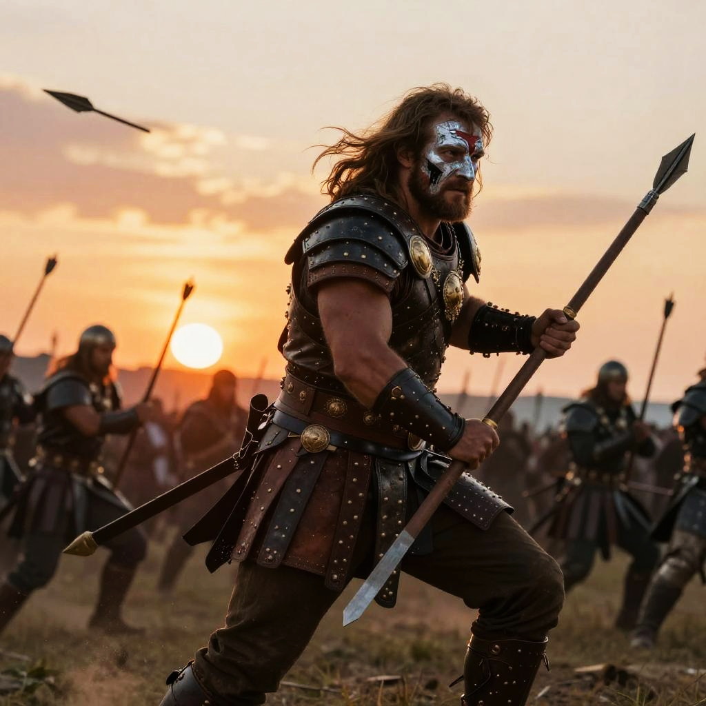 Braveheart war paint on a warrior charging into battle, muscular build, leather armor, fiery sunset behind, flying arrows, dynamic motion, epic war scene
